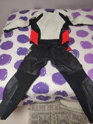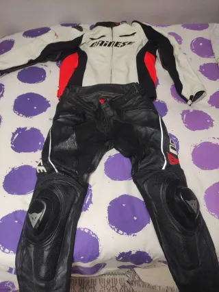 Conjunto de traje de moto de carretera de la marca Dainese. Compuesto por chaqueta y pantalón. - Chaqueta blanca, negra y roja. - Pantalón negro con protecciones. - Diseño deportivo. - Equivalen tanto chaqueta como pantalón a una talla XL.