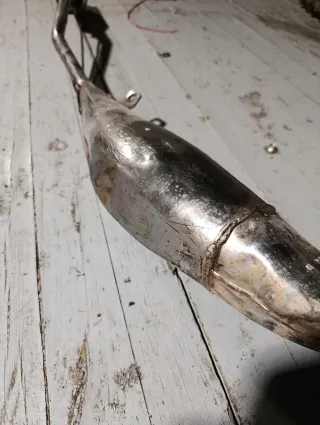 Sistema de escape para Derbi C7. - Diseño para montaje por la parte superior.conpatible c4 derbi country FDS sabanna ect tal y como se aprecia con pequeña abolladuras le falta el tapón del cilrncioso se le puede poner de otro