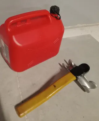 Se vende conjunto de barra antirrobo para volante y garrafa de gasoil. - Barra acero antirrobo de color amarillo y negro. - Garrafa homologada de color rojo.