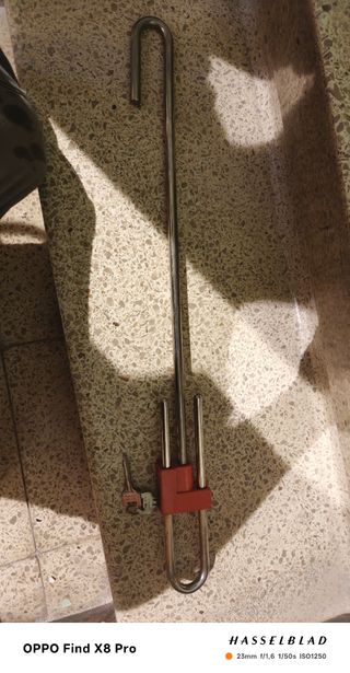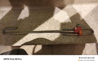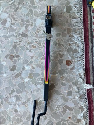 Antigua barra antirrobo para coche, en color rojo. Se encuentra en buen estado. - Fabricada en metal resistente. - Incluye llave. - Diseño robusto y duradero. No hago envios, solo realmente interesados. Gracias