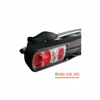 REF: BT001056 Portabicicletas plegable de bola de remolque con antirrobo e iluminación trasera para 3 bicicletas · Nuevo sistema plegable que le permite un montaje, transporte y almacenamiento más cómodo. · Se puede acceder al maletero incluso con las bicicletas montadas gracias a un sistema manual para abatir rápida y cómodamente. · Nueva abrazadera con llave para incrementar la seguridad. · Fabricado en aluminio soporta una carga máxima de hasta 60 kilos. · De fácil instalación y adaptable a la práctica totalidad de vehículos 3/4/5 puertas, monovolúmenes y SUB. · Garantía de 5 años contra defecto de fabricación. ·