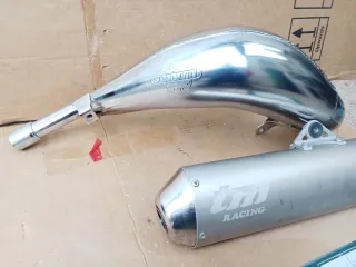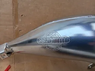 Sistema de escape Scalvini para moto 125cc. - Fabricado en acero inoxidable pulido. - Diseño cónico para un mejor rendimiento. - Incluye soporte de montaje.