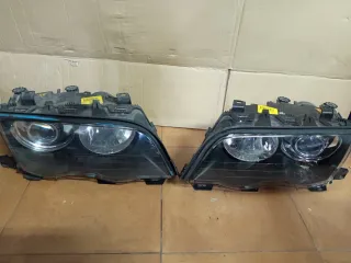 Juego de faros delanteros para BMW Serie 3 E46. Para reparar o para despiece. Usados sin comprobar. Faros incompletos a falta de tapas y algun soporte de luces. Restos de pintura en uno de los faros. Marcas de humedad en el interior de uno de los faros. Uno de los conectores tiene algun tipo de parta en su interior. Referencias 0301089275 y 0301089276