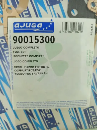 Kit completo de juntas de motor de la marca Ajusa. Nuevo a estrenar. Antiguo stock de tienda. Referencia: 90015300 Compatible con Derbi Yumbo FD/FDS R2, Coppa FT/FDT/FDX y Yumbo FDS Savannah.