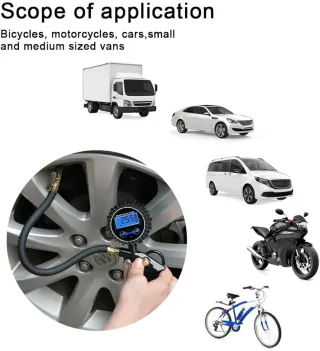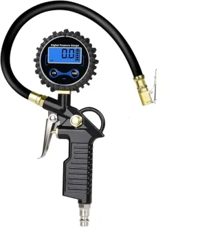 Medidor de presión para neumáticos con pantalla digital. - Diseño tipo pistola. - Manguera flexible. - Conexión rápida.