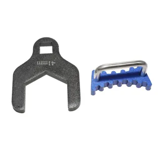 Herramienta de 41mm con entrada cuadrada y una herramienta auxiliar azul con mango metálico. - Llave de metal gris. - Herramienta auxiliar de plástico azul.