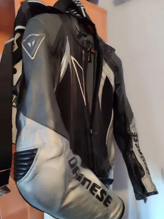 Mono de cuero Dainese de dos piezas. - Talla 48. - Diseño en negro y plateado. - Marca Dainese visible en la pierna. Espaldera incluida