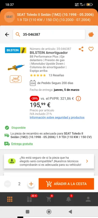 Par de amortiguadores delanteros marca Bilstein B8 performance. 3 años de uso, le queda mucha vida. - Diseñados para mejorar la suspensión. - Componentes de alta calidad para un rendimiento óptimo. - Amortiguadores deportivos ideales SEAT León/Toledo FR