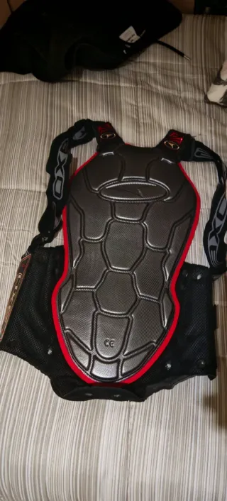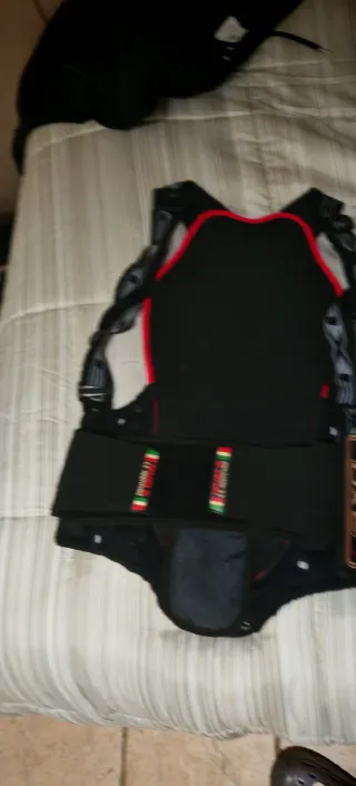 Espaldera protectora para motocross. - Diseño con placas segmentadas. - Borde de color rojo. - Cierre con cinturón ajustable. - Certificación CE.