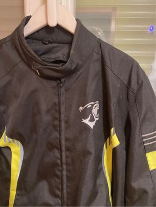 Cazadora de cordura con forro interior. Diseño moderno y funcional. - Color negro con detalles en amarillo y reflectantes. - Logo de pantera en el pecho. - Cuello alto con cierre. - Cremallera frontal.