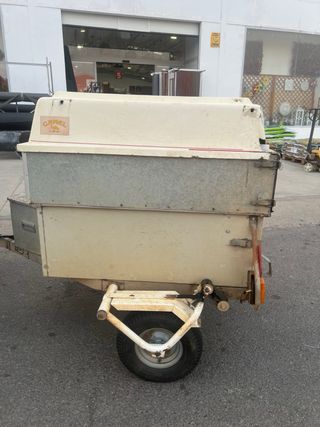 Remolque pequeño, ideal para pequeñas cargas. Tiene un diseño antiguo y está en buenas condiciones, aunque muestra señales de uso. - Remolque de un solo eje. - Estructura metálica. - Color blanco y gris. - Incluye rueda de apoyo.