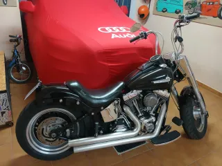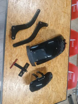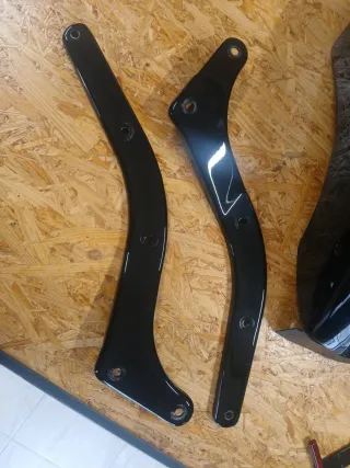 Piezas de guardabarros para Harley Davidson Fatboy del año 2008. Incluye espadines,sporte matrícula y guardabarros delantero y trasero. El guardabarros trasero tiene el hueco para ponerla centralita y los espadines están recortados - Guardabarros delantero negro brillante. - Guardabarros trasero negro brillante. - Soportes de montaje negros.