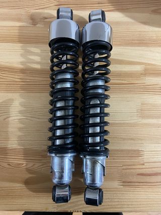Par de amortiguadores para motocicleta. - Color negro y plateado. - Estilo cruiser. - Lo han dado todo. - Para pulir o para pasar itv.