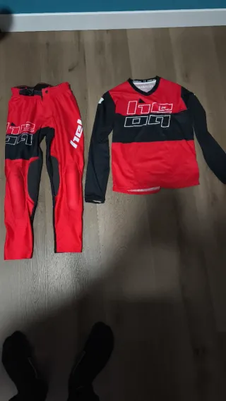 Conjunto de equipación para moto de trial infantil. - Pantalón de trial. - Camiseta de manga larga. - Casco - Botas - Peto