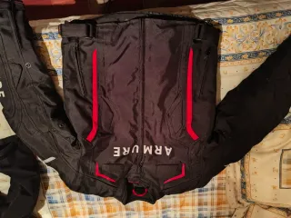 Chaqueta de moto de la marca Armure en talla L. Diseño en color negro con detalles en rojo. No incluye espaldera, compré otra y no le doy uso, está nueva. - Cremallera frontal. - Bolsillos con cremallera. - Cierre ajustable en cuello y puños.