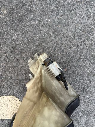Depósito de líquido limpiaparabrisas para BMW Serie 3 E46. - Pieza de plástico. - Tapa negra incluida. -Bomba de limpiafaros -Bomba de limpiaparabrisas Aviso: La bomba de los limpias fuga por donde su propia junta