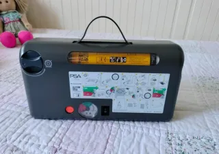 Compresor de aire de la marca PSA, diseñado para su uso en automóviles. Incluye un manómetro para controlar la presión. - Modelo: Air Compressor - Marca: PSA Groupe - Incluye manómetro - Color: Gris