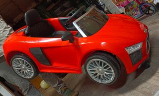 Coche eléctrico infantil con licencia oficial Audi R8, diseñado para un conductor. - Color rojo vibrante. - Diseño deportivo inspirado en el Audi R8. - Asiento cómodo para un niño.
