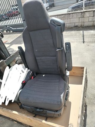 Asiento de conductor para camión Scania serie R. Está en buenas condiciones, aunque presenta un pequeño desperfecto en la tapicería. - Incluye el asiento completo con mecanismos de ajuste. - Tapizado de tela gris oscuro. - Se aprecian algunos signos de uso.