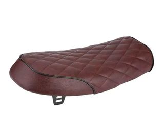 Asiento marrón con diseño acolchado estilo cafe racer. - Tapicería de cuero sintético. - Costuras en rombos. - Ribete negro. Universal.