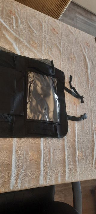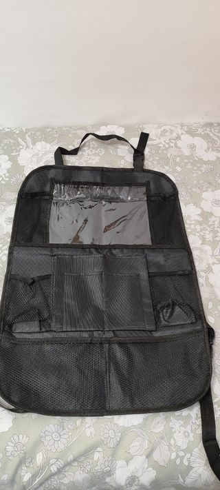 Organizador de asiento para coche, ideal para mantener tu vehículo ordenado. Está en buenas condiciones. - Bolsillo transparente para mapas o dispositivos de vídeo como tablets. - Varias bolsas de malla para guardar objetos pequeños. - Correas para una fácil instalación en el respaldo del asiento.