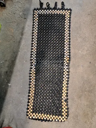 Cubre asiento de coche hecho con cuentas de madera. - Diseño con cuentas de madera negras y detalles en color natural. - Borde decorativo con cuentas de madera en color natural. - Incluye tiras para sujeción en la parte superior.
