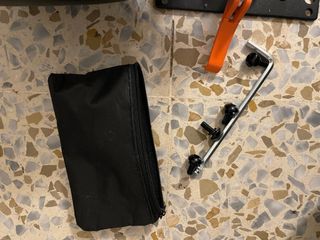 Kit de accesorios para el asiento del patinete Kukirin G2 Pro. Incluye bolsa de transporte, tornillería y llave Allen. - Bolsa de tela negra con cremallera. - Tornillos negros. - Llave Allen plateada.