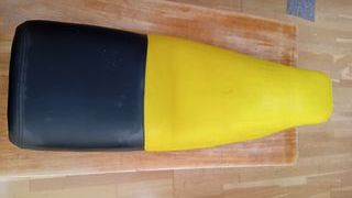 Asiento para motocicleta BMW R 100 GS del año 1988. Presenta un diseño bicolor con la parte delantera en amarillo y la trasera en negro - Parte delantera de color amarillo. - Parte trasera de color negro.