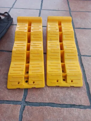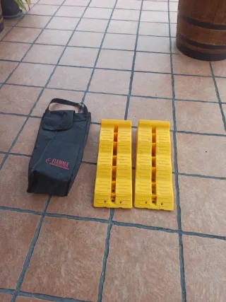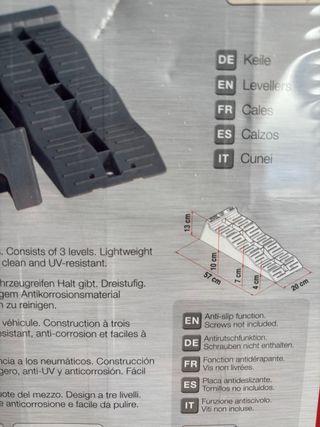 Juego de calzas para autocaravana, diseñadas para nivelar tu vehículo. Nuevas, por estrenar. - Compuesto por 3 niveles. - Fabricadas en material ligero, limpio y resistente a los rayos UV. - Diseño anticorrosión. - Función antideslizante.