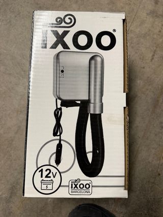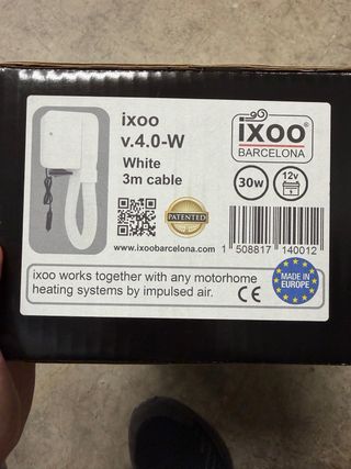 Secador de aire caliente de la marca Ixoo, diseñado para funcionar a 12V. - Ideal para usar en vehículos como coches o autocaravanas. - Incluye cable de conexión para toma de mechero de 12V. - Diseño compacto y portátil.