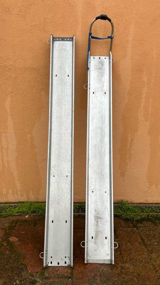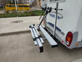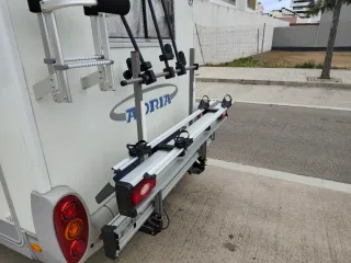 Portamotos y portabicicletas de aluminio para autocaravana. - Estructura robusta y ligera. - Incluye carriles para bicicletas y plataforma para moto. - Luces traseras integradas. Para una moto y tres bicis. Solo para moto vale 2.200 euros...en este puedes llevar la moto y tres bicis...está impecable...lo vendo por qué mi moto pesa más de lo que soporta