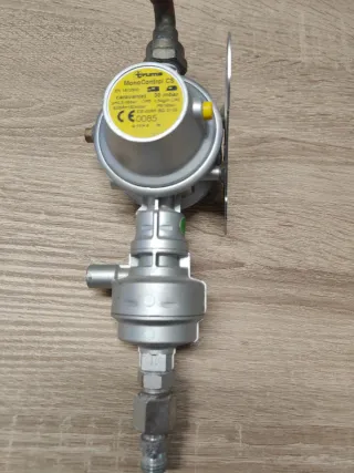 Regulador de gas Truma MonoControl CS para camper o autocaravana. Corta el suministro de gas en caso de accidente o vuelco. Luego se puede resetear con el botón verde. Homologable. Perfecto estado. - Presión de 30 mbar. - Cumple con la norma EN 16129. - Certificación CE 0085.