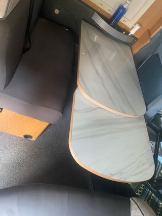 Mesa corredera y abatible para aumentar superficie útil con pie de mesa giratoria con diseño moderno, ideal para tu autocaravana, camper o caravana. Su superficie imita el mármol y tiene un acabado con borde de madera. medidas 105cm x 65cm cerrada 150cm x 65cm abierta - Diseño imitación mármol. - Borde de madera