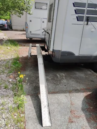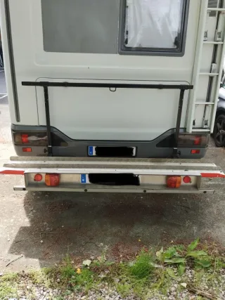 Descripción: porta motos para autocaravana Hymer chasis alko con rampa, plegable, alcanza hasta 200kg de peso .