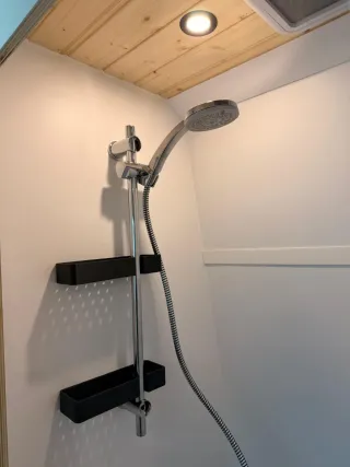 Estantería de ducha para camper/autocaravana. Fijación firme a la barra: no se mueve ni hace ruido en marcha. Diseñada para uso real en camper, no decoración. Con drenaje para evitar acumulación de agua. Producto nuevo, fabricado en España. Hago envío. Pregunta sin compromiso