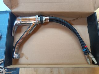 Grifo mezclador de construcción ligera. Con microinterruptor y conexiones de manguera. Altura 13 cm. Longitud de los tubos de conexión 28 cm El taladro es 33 mm. Producto muy poco uso.