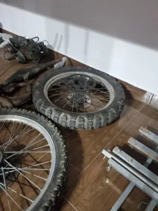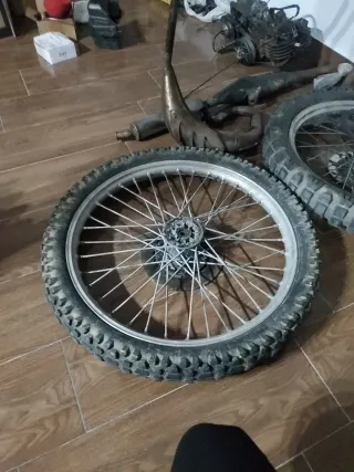 Conjunto de ruedas para moto Rieju. - Rueda delantera con llanta de radios. - Rueda trasera con llanta de radios y neumático. - Piezas de moto para recambio o proyecto.
