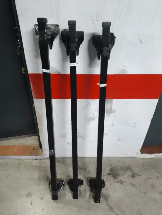 Soportes para baca para furgonetas traveller y del estilo. De la marca Cruz. Como se ve en la foto, incluye anclajes nuevos que compre y que nunca llegue a poner, solo estos ya costaron un buen dinero y estan sin estrenar. El conjunto incluye tres barras, tal y como se ve, ademas de dos juegos completos de soporte, los nuevos y los usados. - Incluyen cerradura con llave, en los antiguos que se podrán cambiar a los nuevos.