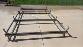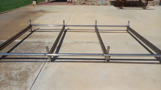 Base metálica para rueda de repuesto de baca. - Fabricada en metal resistente. - Diseño rectangular con soporte central. - Se usaba para llevar rueda de repuesto en la baca de una Mercedes Vito W639. - Medidas: 80cm de largo por 36cm de ancho.