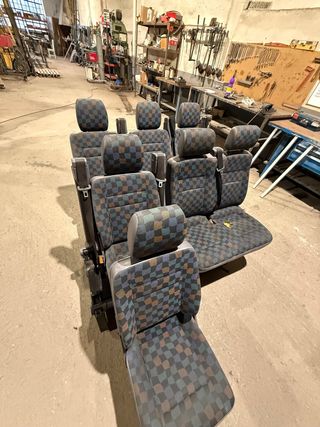 Conjunto de asientos para Mercedes Vito. Tapicería con diseño a cuadros en tonos grises, azules y marrones. - Asientos con reposacabezas. - Cinturones de seguridad integrados. Esta todo en buen estado , salvo un ajero en un sillon. -Se dan tambien barras para baca.