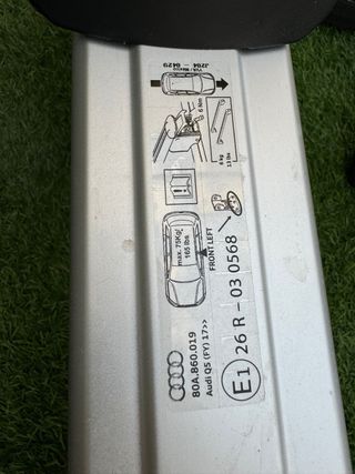 Se venden dos barras de baca para Audi Q5. Están prácticamente nuevas, sin apenas uso. - Fabricadas en aluminio. - Color plata. - Incluyen sus fijaciones.