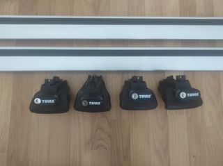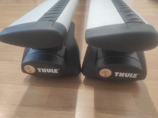 Juego de barras de techo Thule Baca. - 2 Barras Thule SquareBar 760 (108 cm). - 4x Soportes THULE Intracker 4900. - Llave de apertura y cierre. Válido para coches con barras elevadas en el techo. Fabricadas por THULE y vendidas en el Concesionario Oficial de Opel. Estaban montadas en una Opel Zafira pero son compatibles con otros coches, monovolúmenes y SUV con barras en el techo similares.