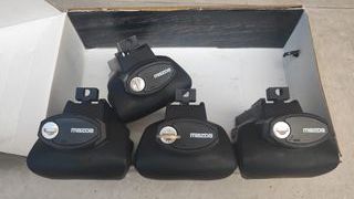 Juego de soportes Thule 757 para baca de Mazda. Están fabricados en plástico negro y cuentan con cerradura. Para coches con barras longitudinales elevedas - Incluye 4 soportes. - Cada soporte tiene un logo de Mazda. - Se incluyen llaves para las cerraduras.