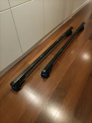 Portaequipajes para la baca de tu coche. Diseñado para transportar carga de forma segura. - Barras de metal negro. - Mecanismo de ajuste. - Soporte con goma protectora.