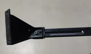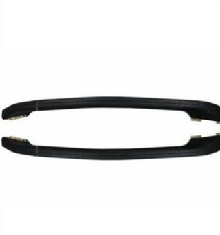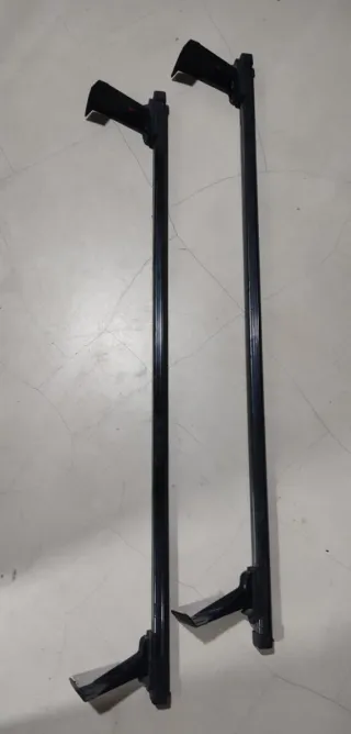 Baca de techo para coche o furgoneta. Fabricada en aluminio negro con soportes de plástico. Barras miden 146cm de largo. - Barras de aluminio. - Soportes de plástico negro. A una de las barras le falta un tapón