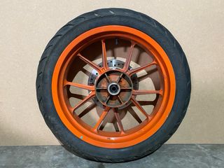 Llanta delantera para motocicleta KTM Duke, válida para adaptar a varios modelos. Medidas: 110/70-17 - Aro de aleación naranja. - Disco de freno incluido. - Neumático montado. rueda, llanta, goma, exc, supermotard, Ktm