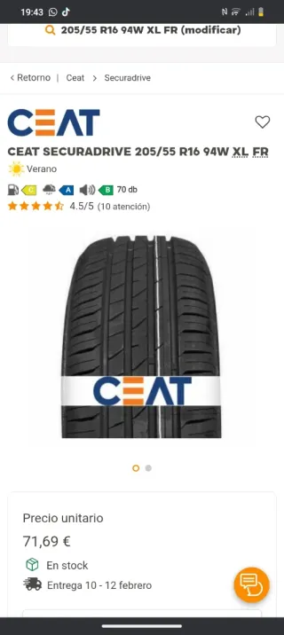 Neumático CEAT Securadrive en medida 205/55 R16 94W XL FR. - Etiqueta energética: C (consumo), A (mojado). - Ruido: 70 dB. - Valoración: 4.5/5 (10 opiniones). - Estado: En stock. -PRESIO POR UNIDAD