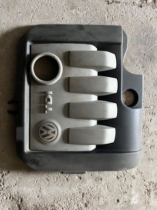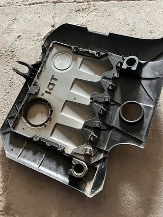 Tapa de motor para Volkswagen TDI. Pieza de plástico negro y gris con el logo de Volkswagen y la inscripción TDI. Pequeña grieta encima de la T
