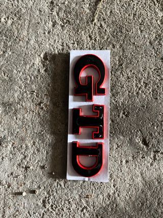 Conjunto de emblemas GTD con acabado en negro y borde rojo. - Diseño deportivo. - Ideales para personalización.