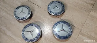 Set de 4 tapones para llantas de Mercedes Benz, compatibles con el modelo W124. Presentan el icónico logo de la estrella de tres puntas rodeado por la corona de laureles y el nombre de la marca. - Logo Mercedes Benz. - Diseño circular. - Acabado plateado y azul.